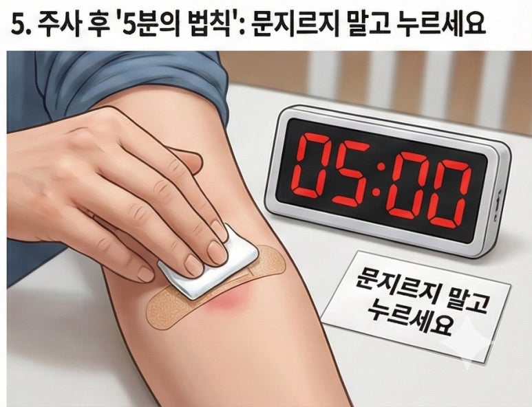 주의할 경우: 주사 맞은 부위가 주먹만 하게 딱딱해지거나, 멍이 점점 넓게 퍼지고, 만졌을 때 열감(뜨끈함)이 느껴진다면 '혈종(피 고임)'이 생겼을 수 있습니다.